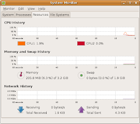 Por otro lado, sabemos que los procesadores x86 no disponen de instrucciones específicas de Entrada/Salida, sino que la forma en la cual se comunican con los periféricos es mediante lo que se llama “Mapeo de Memoria”. Bajo este esquema lo que el procesador hace es asignar direcciones de memoria especiales que al ser escritas, los datos no son almacenados en memoria, sino que se “habla” con un dispositivo determinado, como la pantalla, la placa de red, etc. Estas direcciones de memoria no pueden ser utilizadas para almacenar datos, por lo cual la cantidad de memoria efectiva que nuestro sistema de 32 bits que ya estaba limitado a 4GB, quedará alrededor de 3.2GB, como podemos observar en la siguiente captura del System Monitor de un Ubuntu de 32 bits.